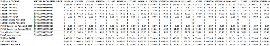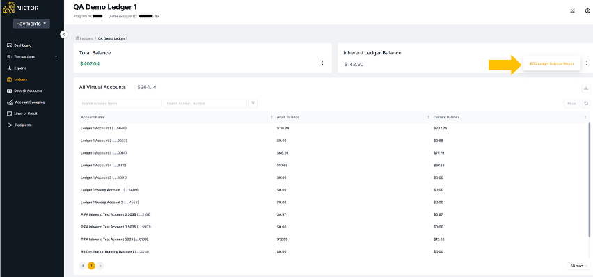 The EOD Ledger Report is intended to provide an overview of the EOD balance of all virtual accounts and the associated FBO Core account on a given day, or over a date range.